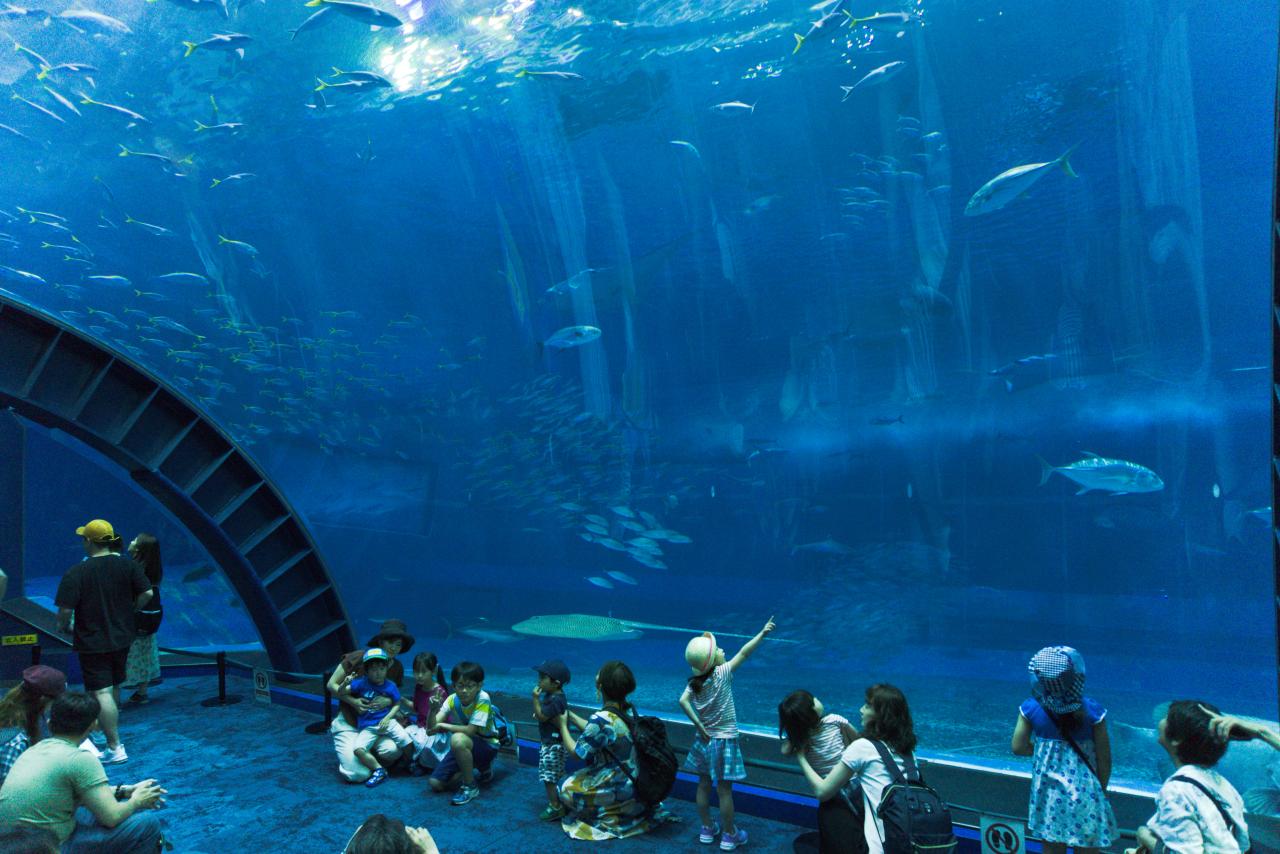 La muestra principal en Churaumi es el enorme tanque de 2 millones de galones de agua llamada Mar de Kuroshio, con mantarrayas, incluyendo algunas que han nacido en el acuario, y tiburones ballena, una de las especies más raras que los visitantes del acuario pueden observar. La muestra del Mar de Coral de Churaumi recibe luz solar directa para que los corales puedan crecer como lo haría en su estado natural. Cuenta con más de 26.000 animales diferentes de 740 especies.