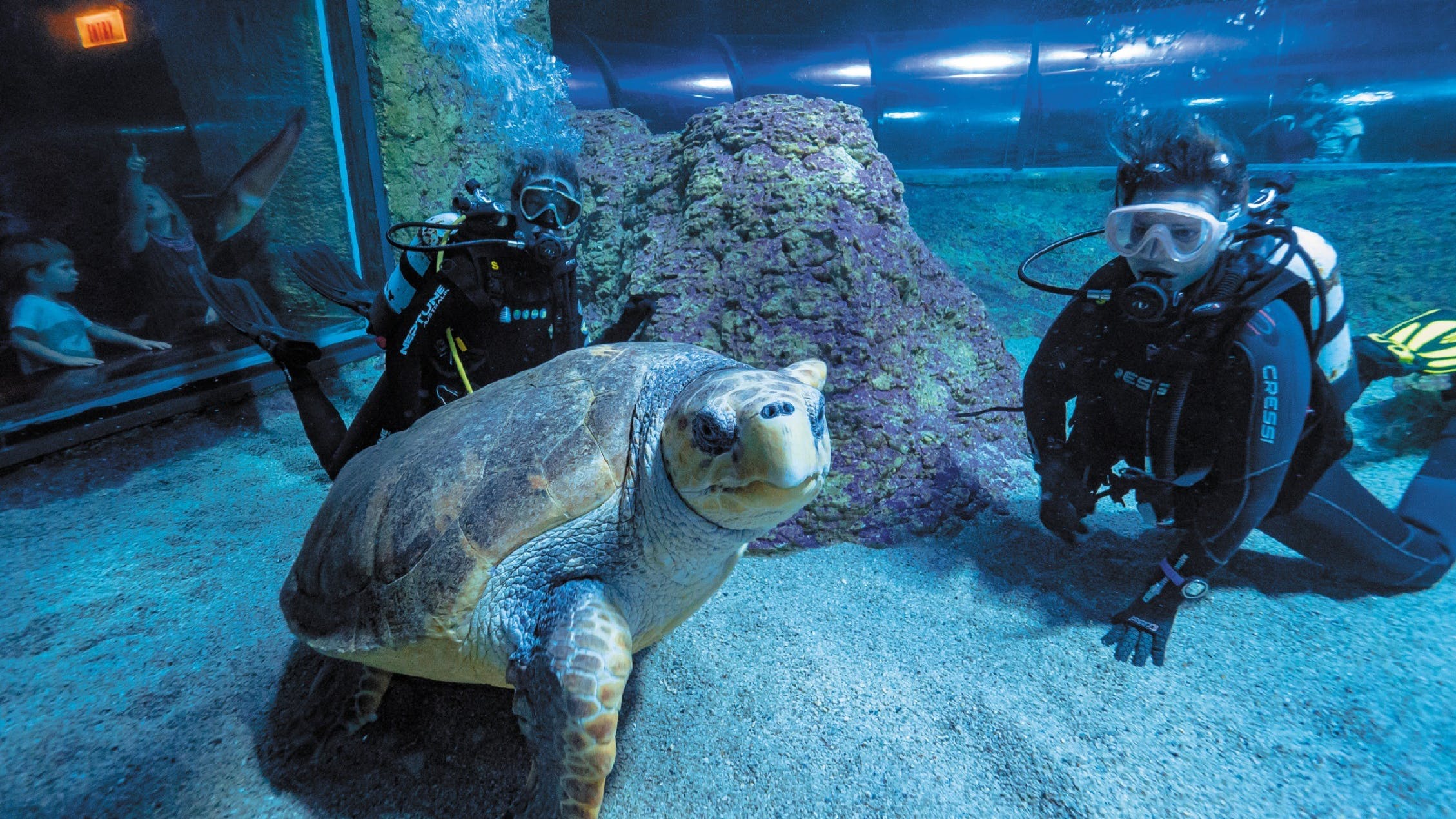 Las atracciones interactivas incluyen un safari oceánico, un baño guiado por el tanque de tiburones y un paseo submarino por un verdadero arrecife de coral, uno de los más grandes de cualquier acuario del mundo.