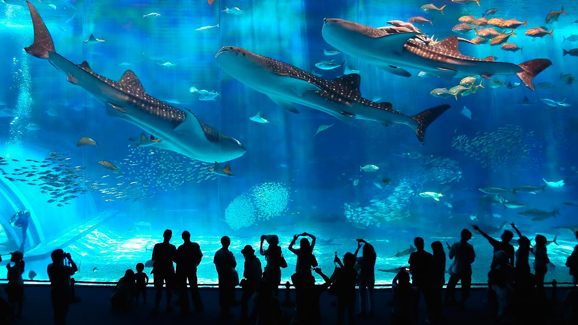 El agua para el océano artificial que se muestra en el Acuario Churaumi en Okinawa es bombeada desde el mar para crear un ambiente auténtico para las especies marinas dentro de esta atracción del Ocean Expo Park.